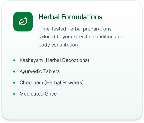 We utilize potent and time-tested Ayurvedic herbal formulations known for their anti-inflammatory, analgesic (pain-relieving), and immunomodulatory properties. These may be administered internally in the form of decoctions (Kashayam), tablets (Vati/Guti), powders (Choornam), or medicated ghee (Ghritam).