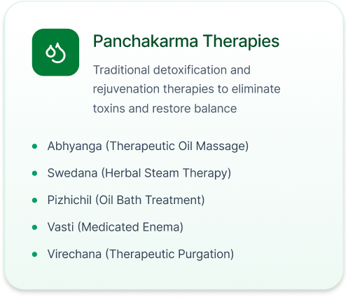 inflammation. - Pizhichil: A unique therapy involving the continuous pouring of warm, medicated oil over the body to promote relaxation and healing.