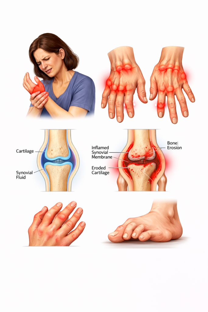 Rheumatoid Arthritis is an autoimmune disorder in which the immune system mistakenly attacks the lining of the joints (synovium). This leads to inflammation, pain, swelling, and stiffness. While it often begins in smaller joints like hands and feet, it may progress and affect other joints over time.