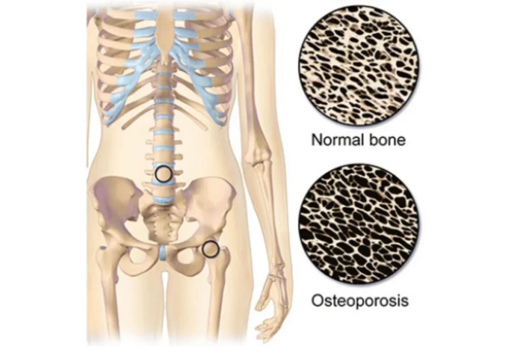 It is a condition in which the density of bone decreases, thereby making the bones fragile. It leads to unusually porous bones that an be compressed like a sponge.